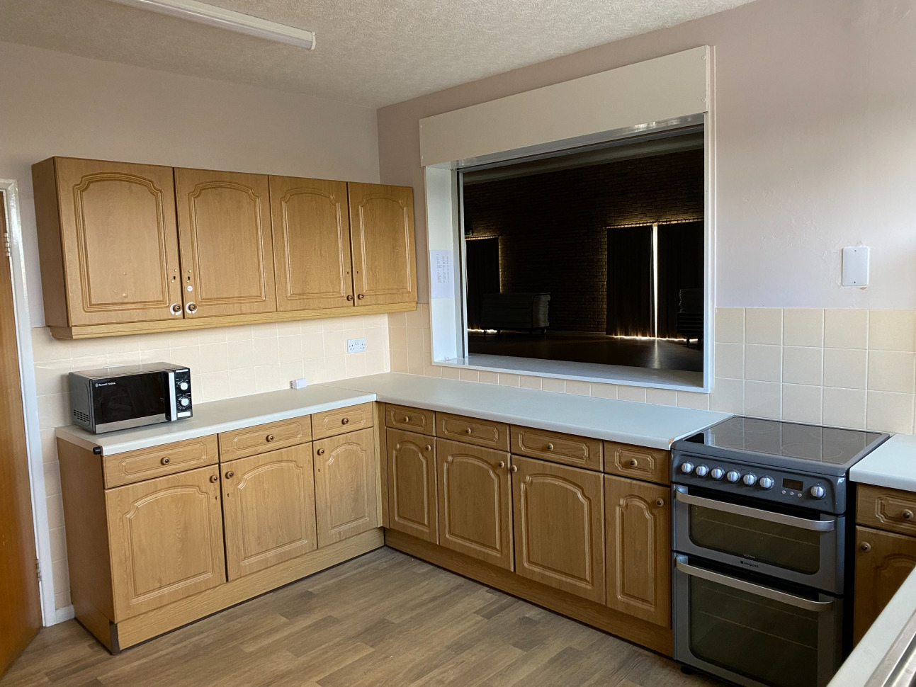 There is a kitchen with a serving hatch through to the main hall.